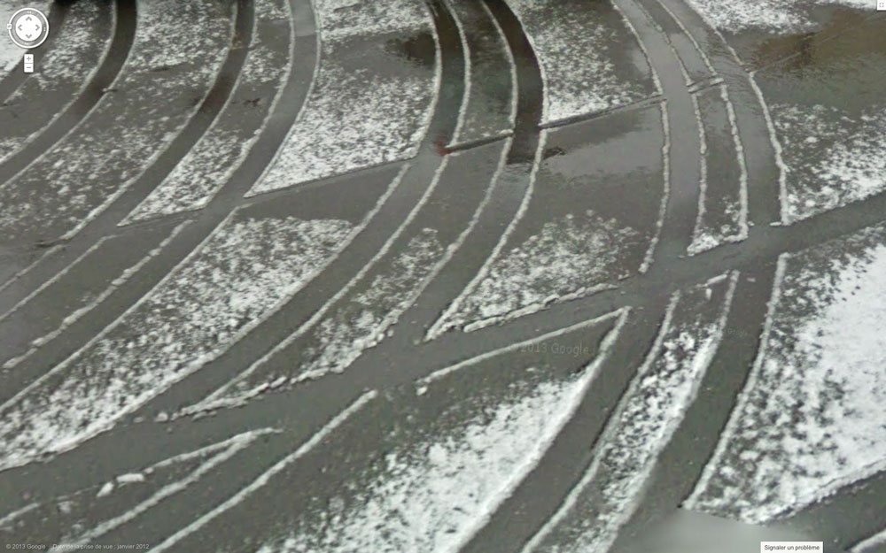 Plus loin, ailleurs, j'ai pris du temps pour observer dans le détail des traces que des roues de voitures avaient laissé dans une fine pellicule de neige encore fraîche.