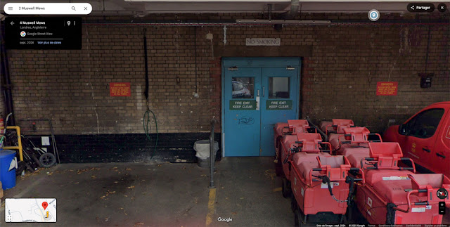 3514e jour - Des portes de garages peintes en bleu, une autre qui est murée, une planche à découper visible au-delà d’une fenêtre, des containers de différentes couleurs, des cartons en vrac… Muswell Mews, dans le nord de Londres, voie longue d’une petite centaine de mètres à peine, sans grand intérêt et en cela bigrement intéressante à mes yeux.