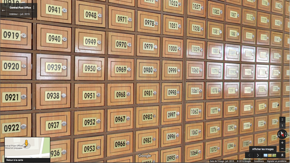 1732e jour - Poste centrale d’Oulan-Bator. Elle dit : “T’imagines ! Une installation là-dedans ! Un texte glissé dans chacune des boxes… une sorte de conte des mille et une nuits des temps modernes. Il s’agirait de les ouvrir pour découvrir !”