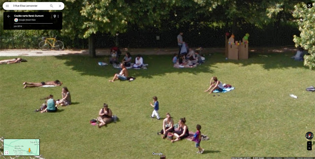 3327e jour - Les pelouses de Reuilly. La semaine dernière, j’y suis allé en “repérage” dans Street View parce que dans l'après-midi j'avais quelqu'un à photographier – je cherchais un espace vert dans le quartier. L’endroit me semblait parfait mais quand finalement nous nous sommes pointés sur place, les grilles du parc, à mon grand désarroi, étaient fermées. Les pelouses ne rouvriront pas avant l’automne car ici aussi on prépare les JO. C’est sur les pelouses de Reuilly en effet qu’on est en train d’installer le camp de base des 5000 militaires qui assureront la sécurité des jeux. Le camp sera baptisé camp Alain Mimoun en hommage au champion olympique du marathon de 1956. Mes portraits, il a fallu que j’aille les faire ailleurs. Ne me restent que les images faites dans Street View – parfois, la vie est plus facile dans les mondes virtuels.