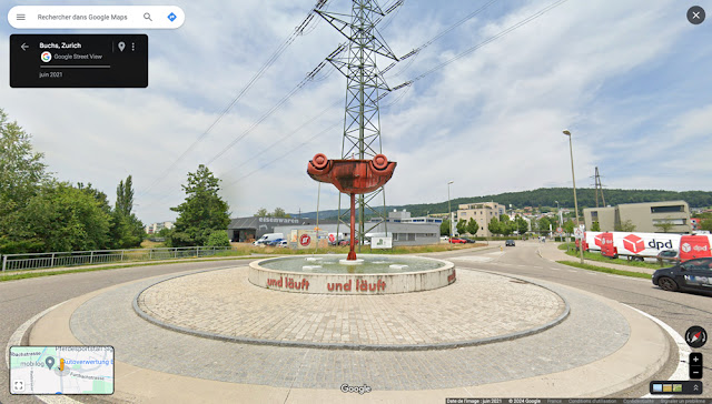 La sculpture est l’œuvre de John Stobler, artiste local. Je ne sais pas grand chose de lui. Parcourant la presse zürichoise, j’ai juste découvert qu’en 2019 la sculpture avait été rénovée – les roues, par exemple, étant alors changées.